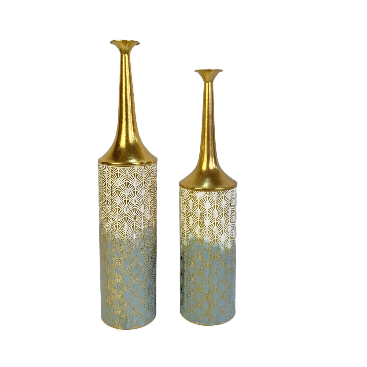 Elevate your interior with this handcrafted set of 2 metal floor vases – a fusion of contemporary elegance and artisanal quality. With different heights and removable narrow tops, you can transform the design from sleek and tall to minimal and cylindrical in seconds.